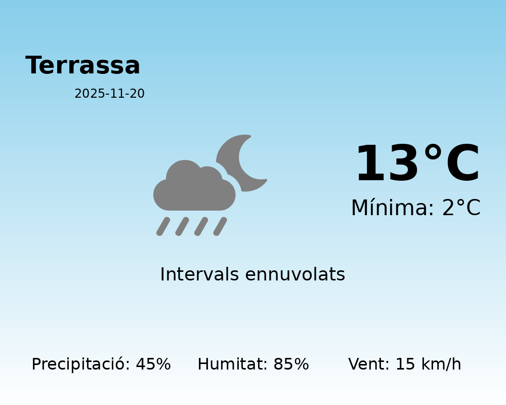 Bon dia, Terrassa! Avui és un dia per abrigar-se bé, ja que la jornada estarà marcada per temperatures més aviat fresques i presència de precipitacions. Vegem amb detall què ens espera aquest dia.