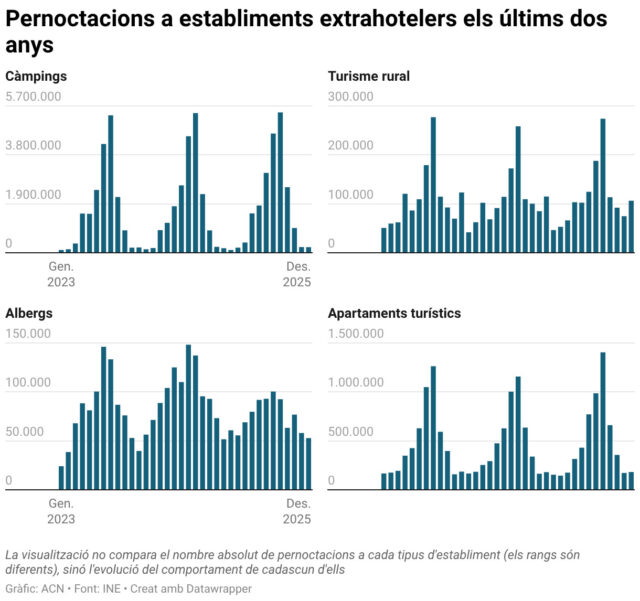 ACN Barcelona – Els càmpings catalans van registrar el seu millor any el 2025, segons l’estadística d’establiments extrahotelers feta pública per l’INE aquest dilluns, que aporta dades des del 1999. Amb més de 21,1 milions de pernoctacions per part de més de 4,1 milions de viatgers, els càmpings mai havien registrat aquestes dades, que han impulsat el conjunt d’establiments turístics no hotelers a fer també xifres rècord. Amb tot, les cases rurals i els albergs han reculat respecte a l’any anterior, i es queden per sota del mig milió i dels 400.000 visitants, respectivament. Alhora, els apartaments turístics van a l’alça en comparació amb el 2024, però no arriben a nivells prepandèmia, quedant-se en 1,1 milions de turistes.