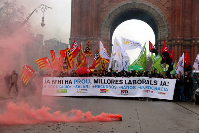 ACN Barcelona – Els sindicats educatius s’han manifestat aquest dissabte a Barcelona per demanar millores salarials i per al sistema educatiu. Es tracta d’una convocatòria unitària dels sindicats USTEC, Professors de Secundària, CCOO, UGT i CGT. La marxa, sota el lema ‘Més salaris, menys sobrecàrrega’, ha sortit de l’Arc de Triomf de Barcelona i ha acabat a la plaça Comercial. Les organitzacions sindicals acusen el Departament d’Educació d’incomplir el “compromís” de fer-los una proposta salarial. La manifestació forma part d’una onada de protestes entre les quals també s’inclou la vaga convocada per a l’11 de febrer. La portaveu d’USTEC, Iolanda Segura, ha avisat que continuaran fent pressió a l’administració amb més mobilitzacions i vaga.