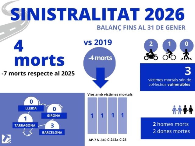 El Servei Català de Trànsit (SCT) informa que durant el mes de gener de 2026, es van registrar 4 víctimes mortals en accidents a les carreteres interurbanes de Catalunya, una disminució significativa respecte al mateix període de l’any anterior, quan hi van haver 11 morts. Així doncs, aquest any han perdut la vida 7 persones menys en comparació amb el gener de 2025.