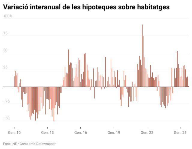 ACN Barcelona – El nombre d’hipoteques sobre habitatges inscrites a Catalunya van superar les 9.000 a l’octubre per primer cop des del 2007, però van notar un alentiment del ritme de creixement interanual (+1,3%), segons l’Institut Nacional d’Estadística. Les 9.025 hipoteques registrades representen la xifra més alta del desè mes de l’any des de la bombolla immobiliària, l’octubre del 2007. Si es compara amb el mes anterior, es van firmar un 14,76% més d’hipoteques sobre habitatges. Pel que fa a l’import prestat, va pujar fins als 1.714,8 milions d’euros, un 16,67% més que l’octubre del 2024, mentre que la quantitat mitjana per hipoteca es va situar en els 190.012 euros, un 12,5% més i la dada més alta del mes dels registres que es remunten al 2003.