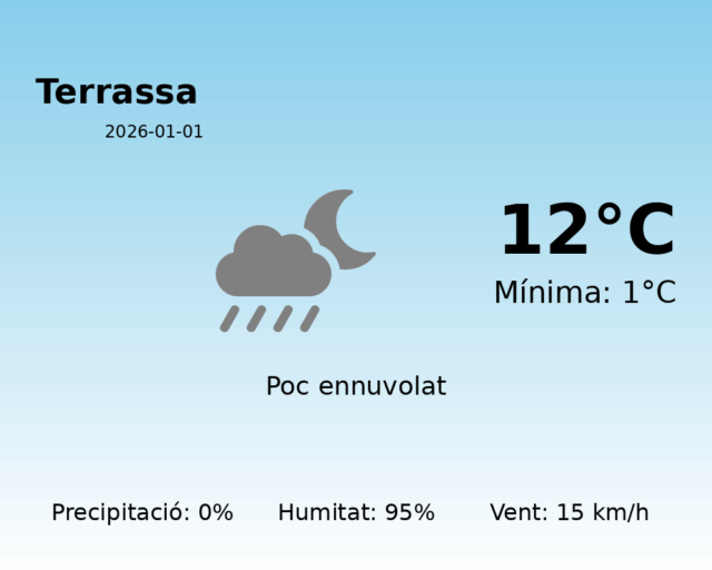 Bon dia a tots els residents de Terrassa! Avui, començant aquest any nou, ens trobem amb unes condicions meteorològiques bastant fresques però sense complicacions importants.