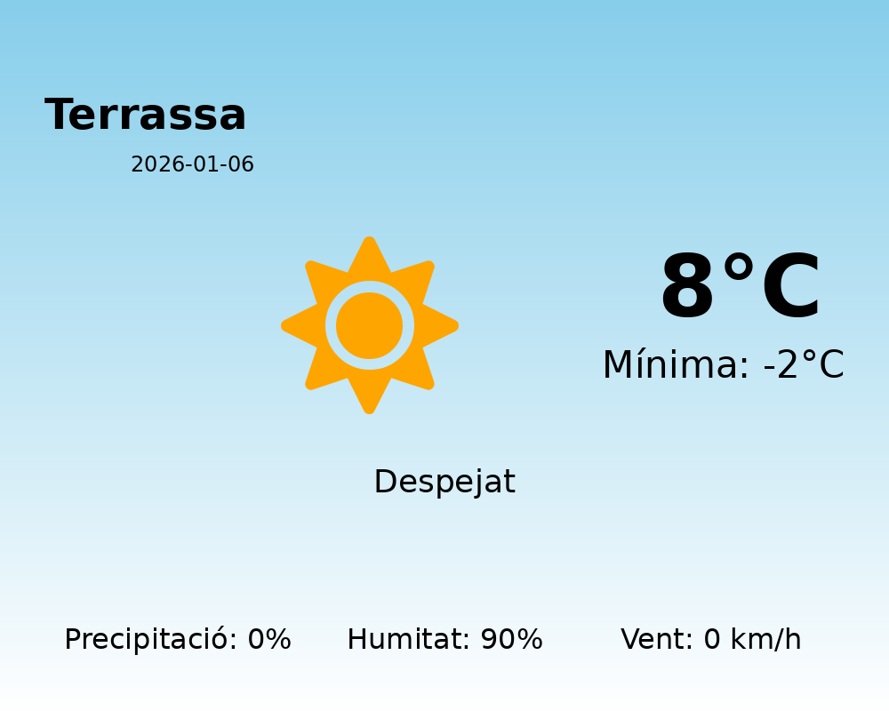 En conclusió, aquest 6 de gener es presenta com un dia fred però assolellat a Terrassa, sense vent ni precipitacions, oferint una bona oportunitat per gaudir de l’exterior sempre que anem preparats per les baixes temperatures.