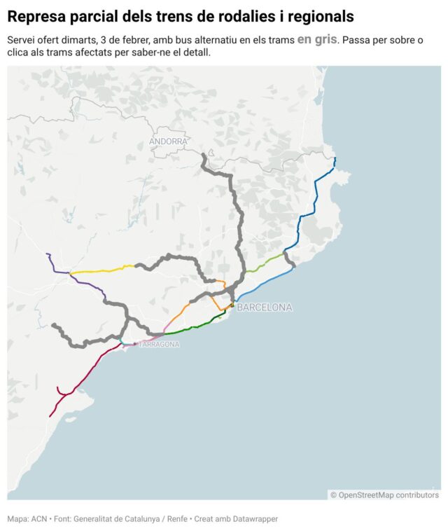 ACN Barcelona – Rodalies començarà el servei dimarts amb les mateixes condicions que avui, segons ha explicat a l’estació de Sants el portaveu de Renfe a Catalunya, Antonio Carmona. Es manté, doncs, el servei per carretera per a onze línies. Aquest dilluns s’ha recuperat en tren el tram de Figueres a Portbou de la línia R11, que demà farà tot el recorregut en tren. El portaveu de Renfe ha reiterat el missatge del matí, “s’està garantint la mobilitat” dels usuaris en transport ferroviari o en bus, mentre es continua treballant per recuperar “progressivament” més trams en tren. Així, l’R1, RG1, R3, R4, RL4, R7, R8, R13, R14, R15 i RT1 mantenen trams en tren i en autobús, mentre que l’R2 nord, l’R2 sud, l’R11, l’R16 i l’R17 presten tot el servei en tren.