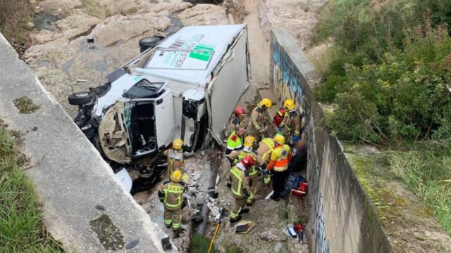 Un camió frigorífic ha sortit de la via C-1413A, a Sant Cugat, i ha caigut des d’un pont fins a la riera, obligant a una intervenció d’emergència dels Bombers.